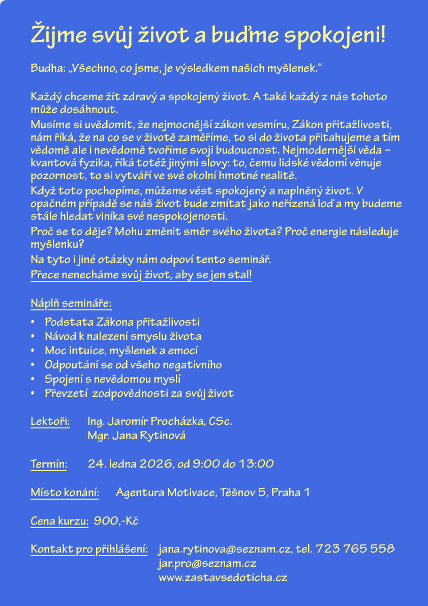 Zvu vás na další z našich seminářů, tentokrát o Zákonu přitažlivosti... Seminář o zákonu přitažlivosti vám srozumitelně ukáže, jak vaše myšlenky, emoce a pozornost ovlivňují každodenní realitu.