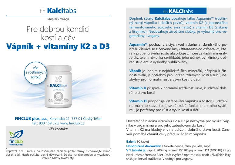 Přípravek Kalcitabs obsahuje vitamíny K2 a D3 a vápník a pomáhá udržovat optimální kondici cév a kostí. Díky tomuto preparátu dokáže lidské tělo správně využít vápník a jeho zabudování do kostí. Tento přípravek naopak pomáhá chránit cévy před ukládáním vápníku.