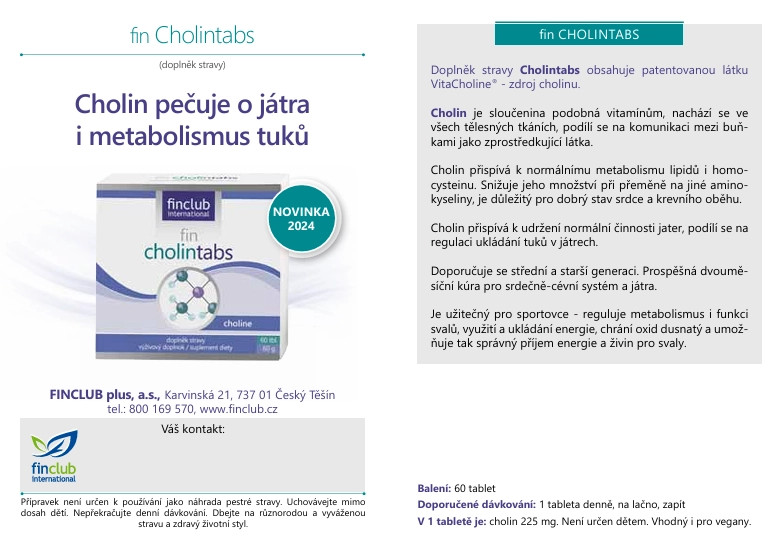 Doplněk stravy Cholintabs pečuje o naše játra a o metabolismus tuků. Podílí se pozitivně na regulaci ukládání tuk v játrech a přispívá k normálnímu metabolismu tuků.