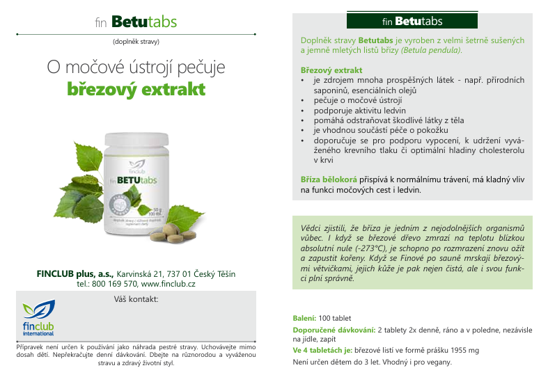 Betutabs pozitivně pečuje o naše močové ústrojí, aktivně podporuje ledviny. Je vyroben ze sušených namletých listů břízy. Pomáhá odstraňovat škodlivé látky z těla, pečuje o naši pokožku a pomáhá též udržovat vyváženou hladinu krevního tlaku a optimální hladiny cholesterolu v krvi.
